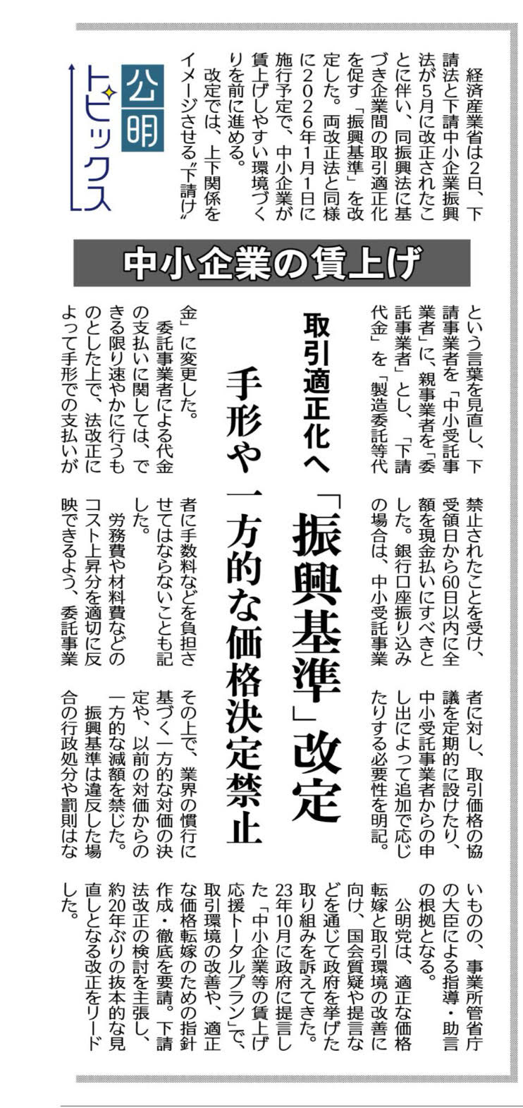 公明党は長年、中小企業の取引環境改善と適正な価格転嫁を訴えてきました。今回の法改正はその成果でもあります。地域を支える中小企業が持続的に発展できるよう、私も現場の声を県政に生かしてまいります。