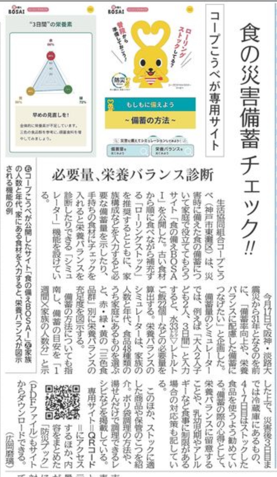 神戸新聞では、生活協同組合コープこうべが公開している専用サイト「食の備えBOSAI」が紹介されていました。