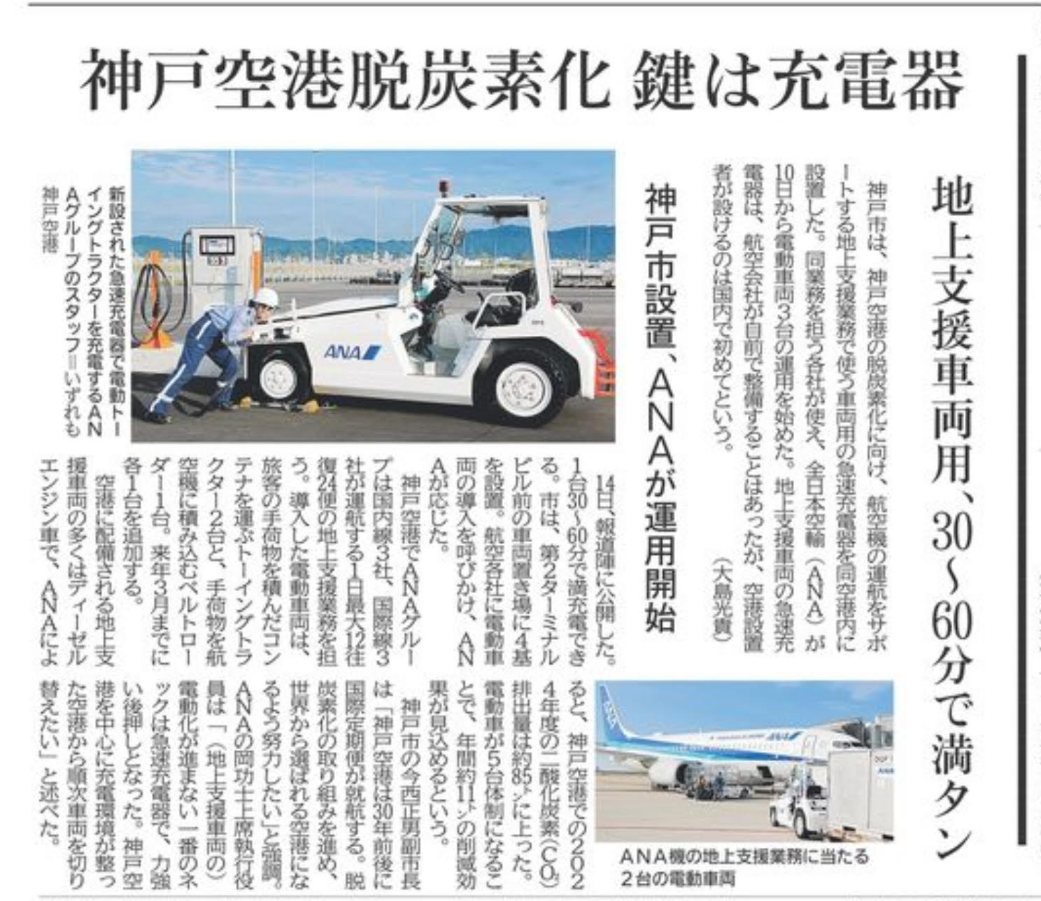 神戸空港では、地球温暖化対策の一環として、空港制限区域内に地上支援車両(GSE)向けの急速充電器を設置し、電動車両の運用を本格化しました。制限区域内にGSE用急速充電器を整備・共用するのは、全国で初めての取り組みです。(出典:神戸新聞)