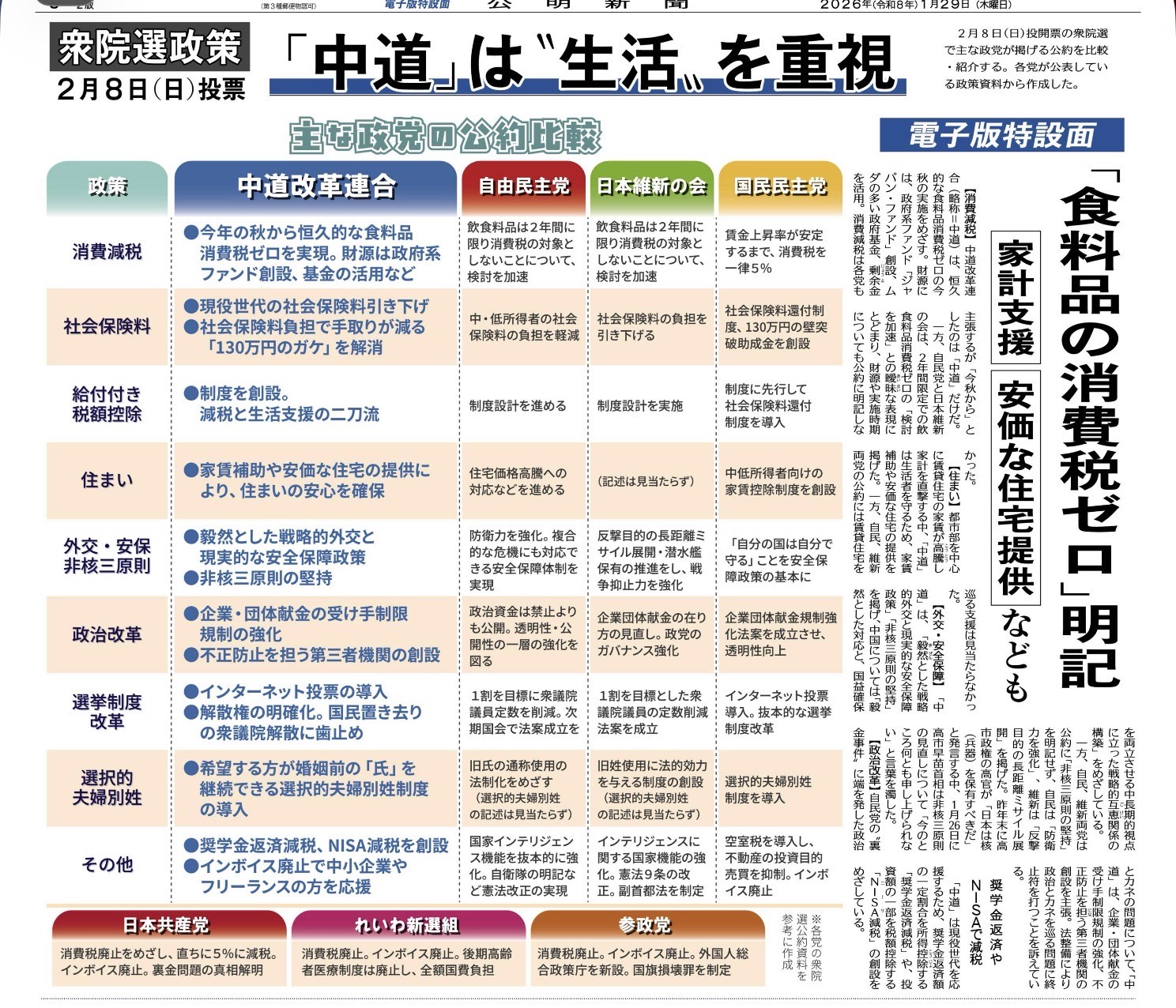 公明新聞では、「中道は生活を重視」という視点から主要政党の公約を比較し、