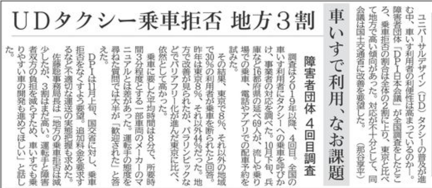 障害者団体「DPI日本会議」によると、東京での乗車拒否は8%だった一方、**その他の地域では30%**