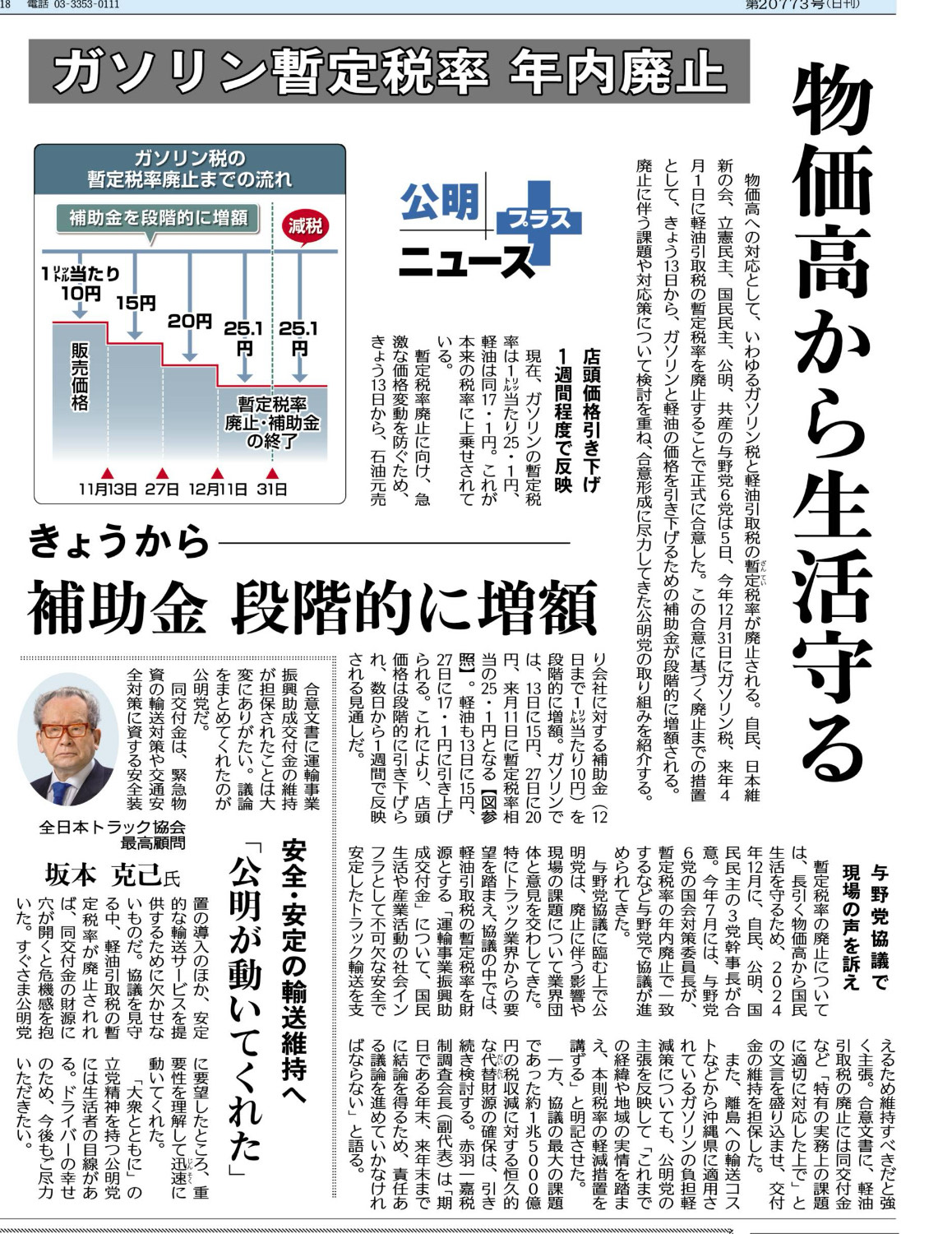 全日本トラック協会の坂本会長も「公明党の働きで安定輸送が維持できる」と述べています。
