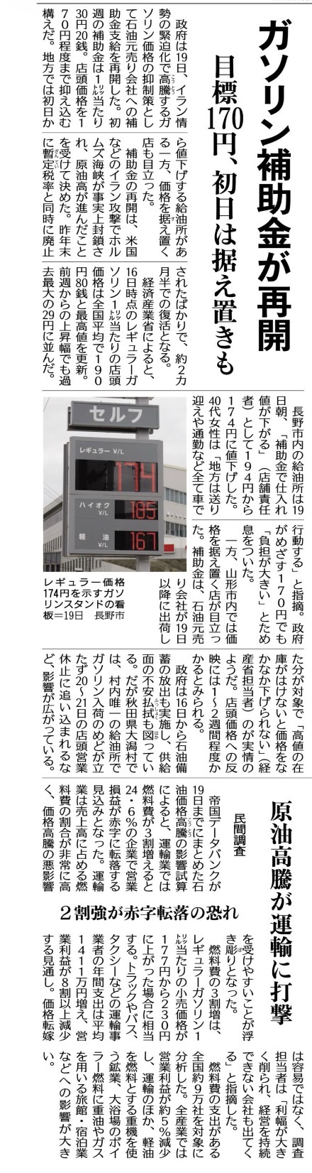 初週の補助額は1リットル当たり30円20銭で、急激な価格上昇を抑える措置が講じられています。