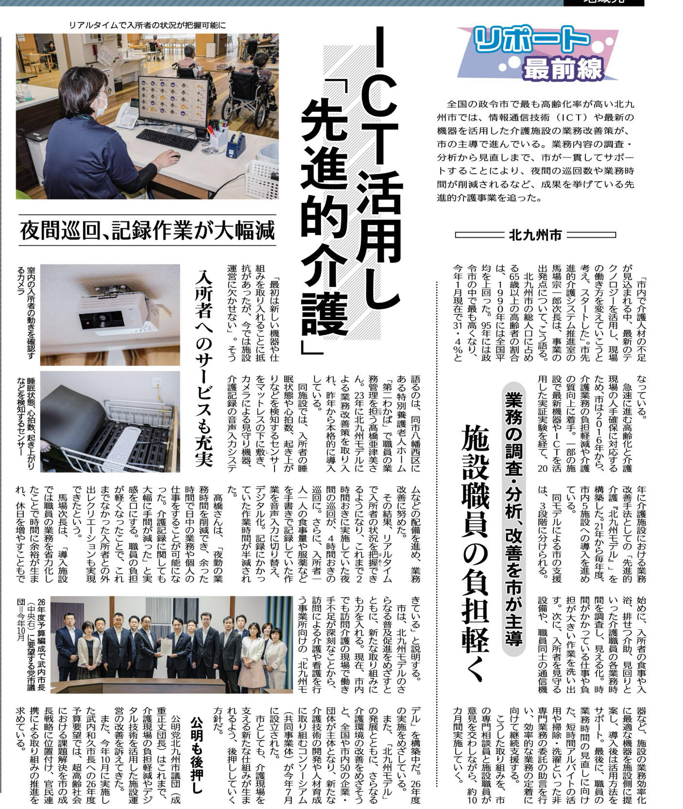 今回は、公明新聞で紹介された「ICTを活用した介護の先進モデル『北九州モデル』」をご紹介します。北九州市は2020年に独自モデルを構築し、全国から注目されています。