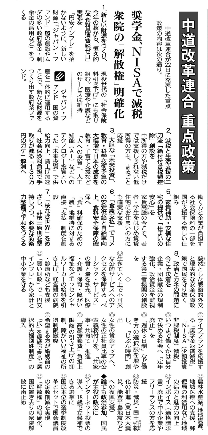 本日は、公明新聞に掲載された中道改革連合による重点政策の発表についてご紹介します。