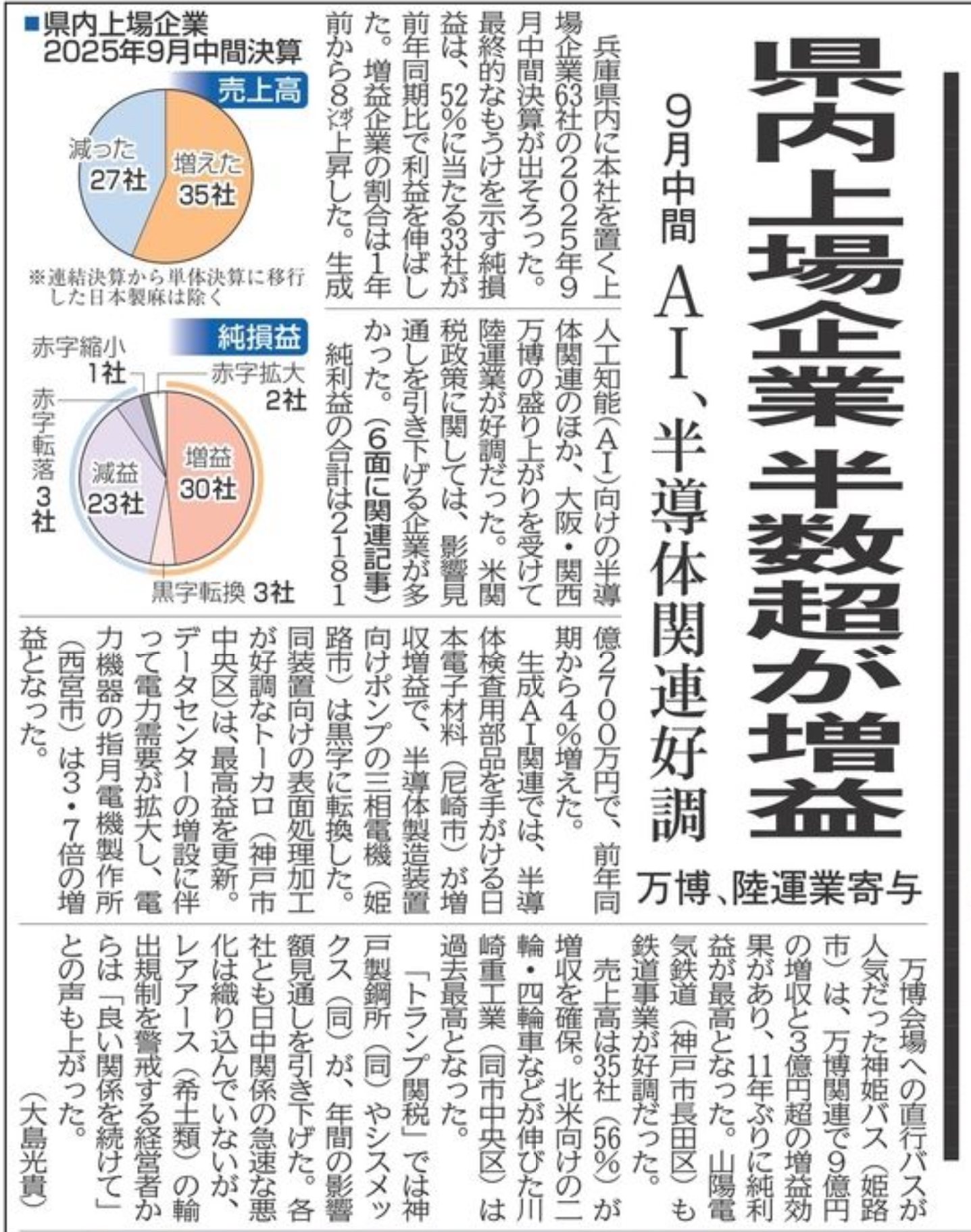 また、大阪・関西万博を見据えた人流増や観光需要の回復も追い風となり、神姫バス(姫路市)など陸運業の業績も改善。