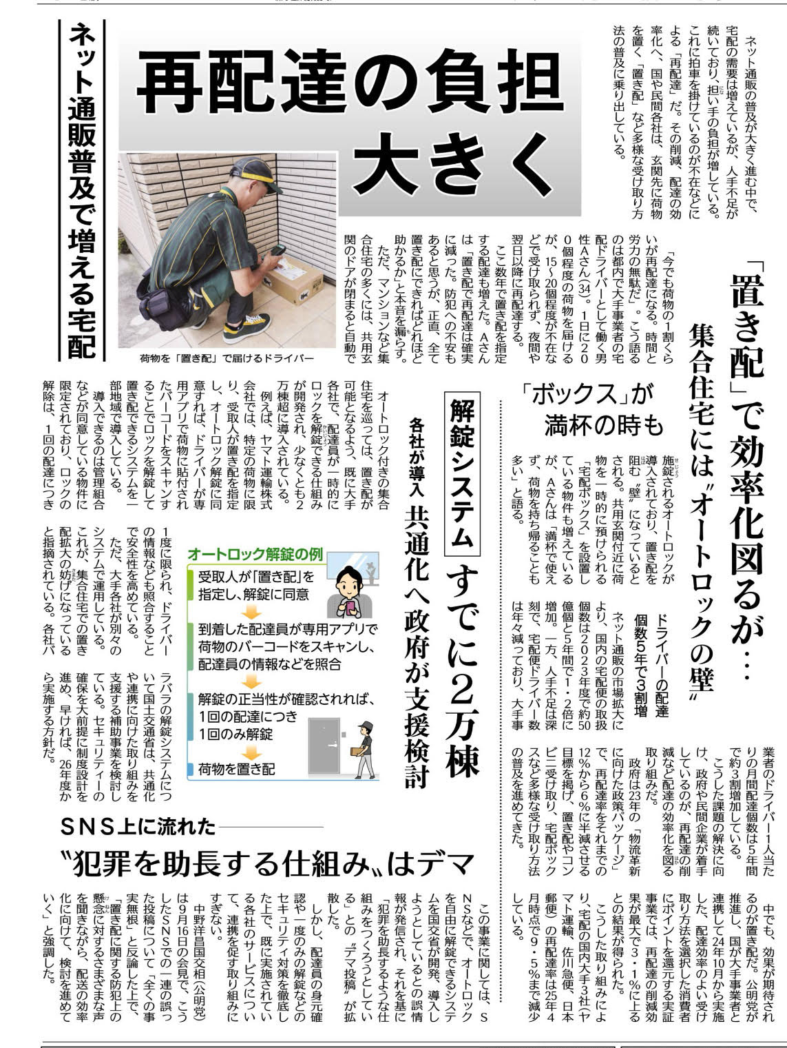 ネット通販の拡大で宅配便が急増し、再配達が課題となっています。国交省の調査では再配達率が約10%で、これにより年間約25万トンのCO₂が発生し、労働力換算で約6万人分に相当します。国は「置き配」や「オートロック解錠システム」の導入を進めています。