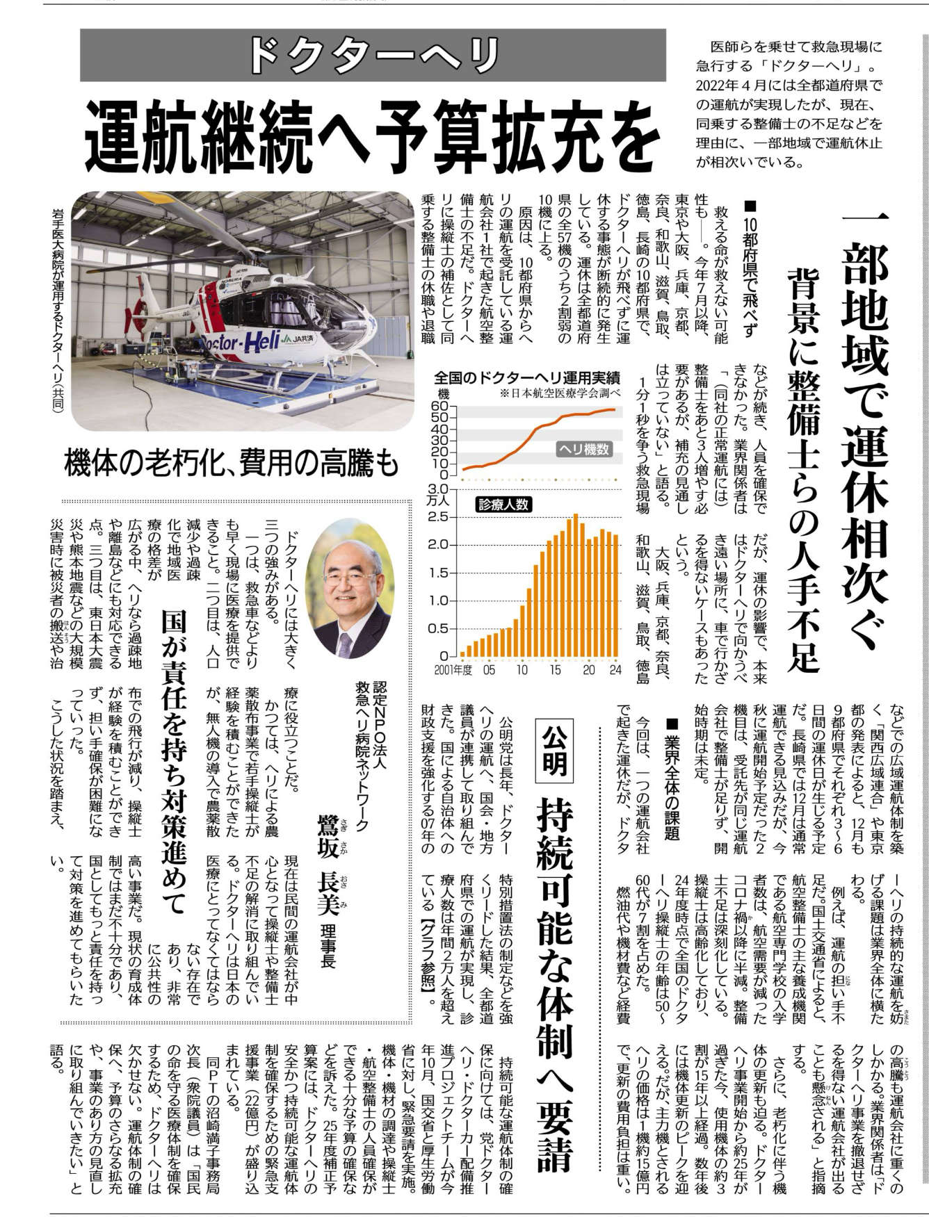 本日は、公明新聞で報じられた「ドクターヘリの運航継続に向けた課題と予算拡充の必要性」