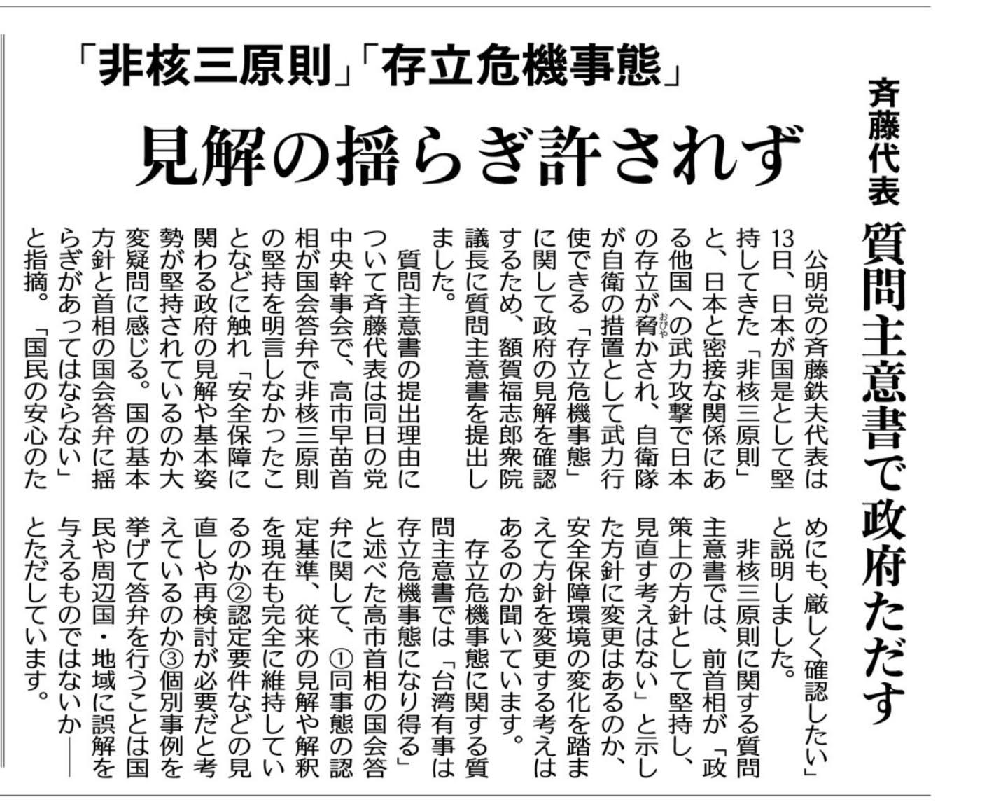 斉藤代表は、この原則が揺らぐことのないよう政府に見解を求めました。質問主意書への回答は「閣議決定」で確定するため、極めて重い位置づけです。
