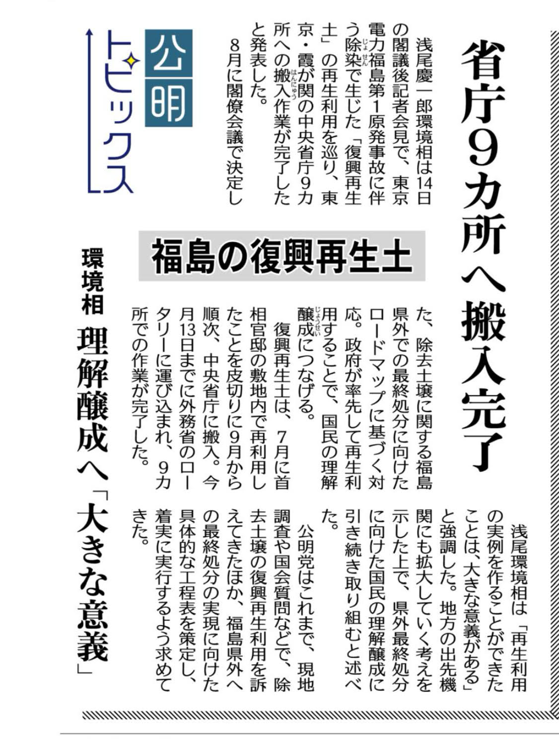 福島第一原発事故の除染で発生した「復興再生土」の再利用が本格化しているニュースをご紹介します。環境省は10月13日、東京・霞が関の中央省庁9カ所への搬入作業を完了し、首相官邸分を合わせて県外10カ所で実施されたと発表しました。(出典:公明新聞)