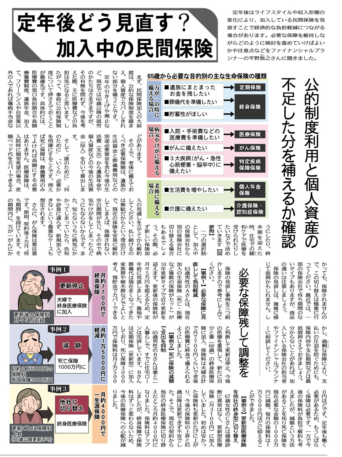 公明新聞の記事では、「個人年金保険」「介護保険」「終身医療保険への切替」「死亡保障の減額」などを65歳以降の備えとして紹介しています。