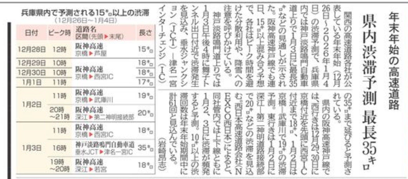 兵庫県内では12月26日から2026年1月4日にかけて、15キロ以上の渋滞が発生すると予測され、