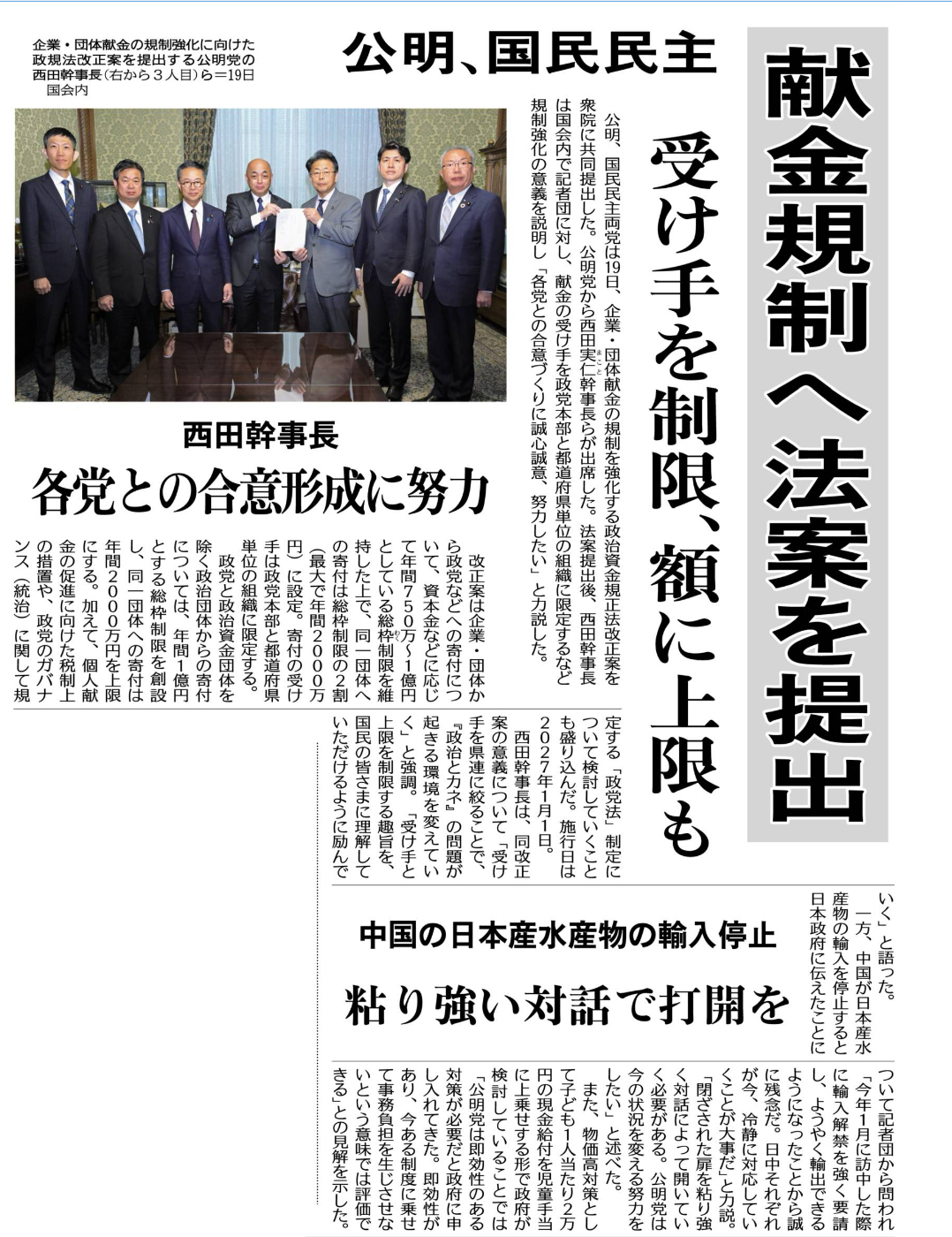 法案提出後、西田実仁公明党幹事長は「各党との合意づくりに誠心誠意努力したい」と述べ、