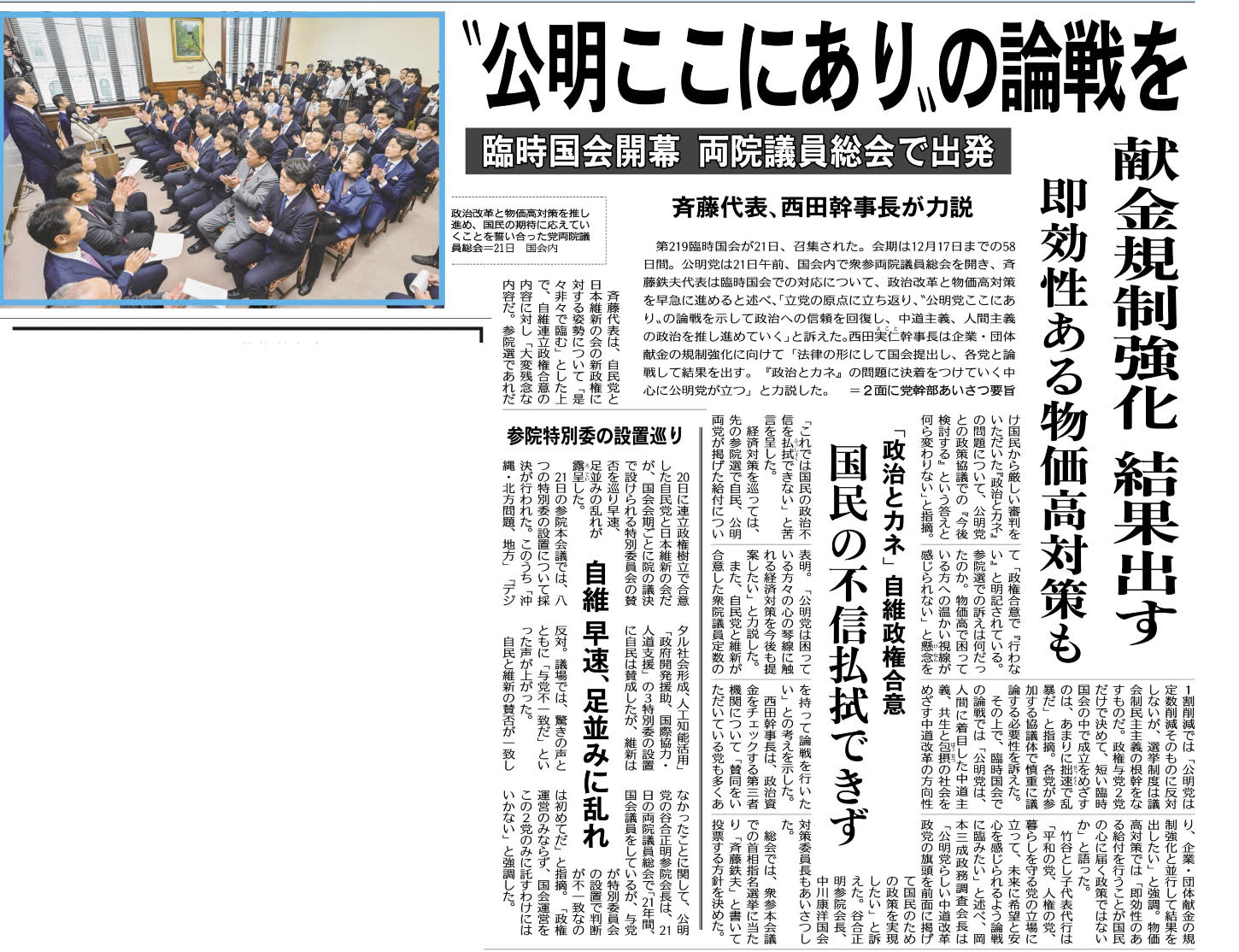 公明党は両院議員総会を開き、政治の信頼を取り戻すため、