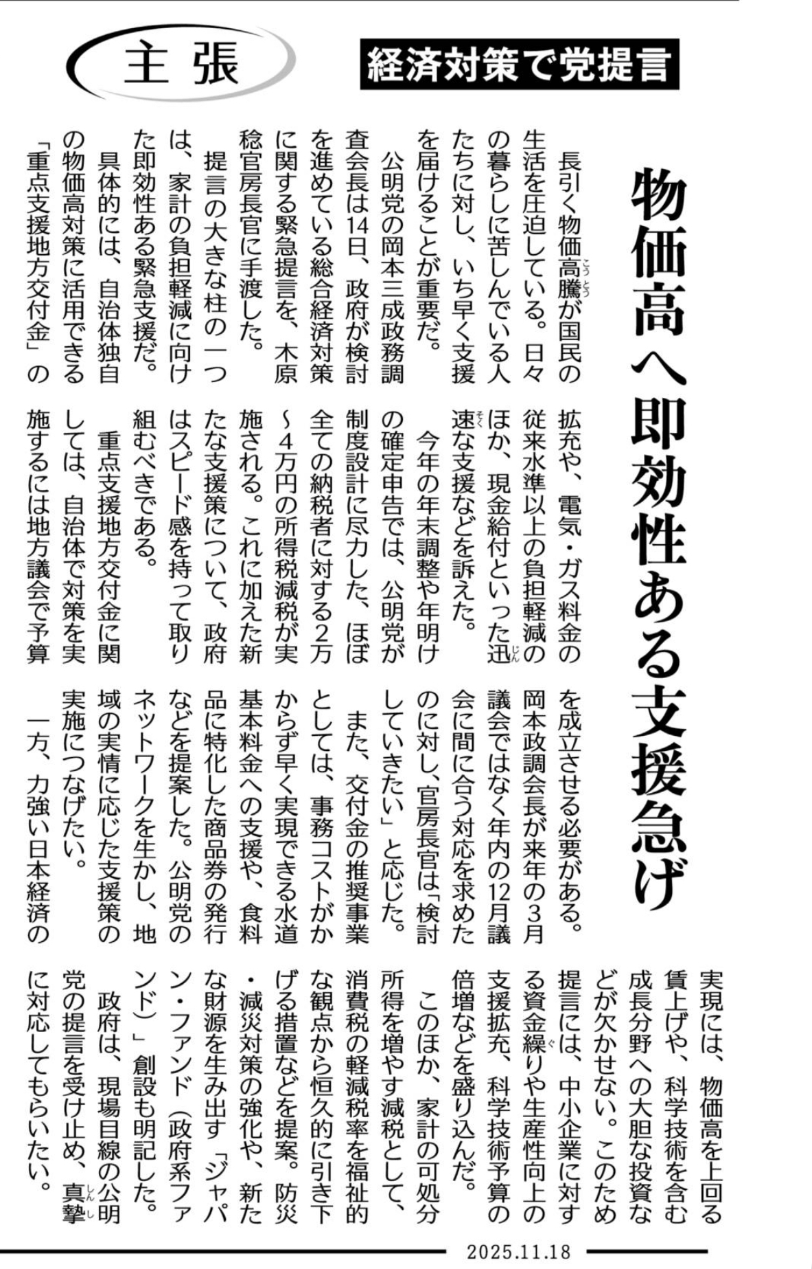 公明党は11月14日、電気・ガス料金や生活必需品の高騰に対応する「重点支援地方交付金」の拡充を要請しました。