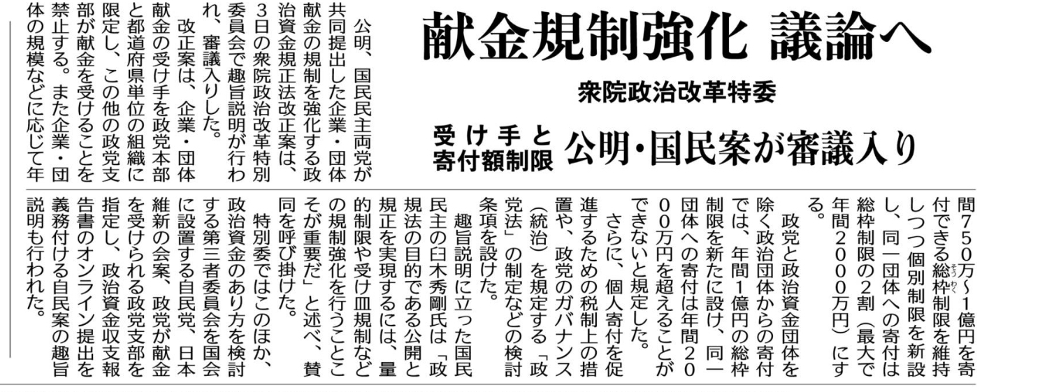 本日は、公明新聞で報じられた衆議院の政治改革特別委員会における「献金規制強化」を巡る議論について、