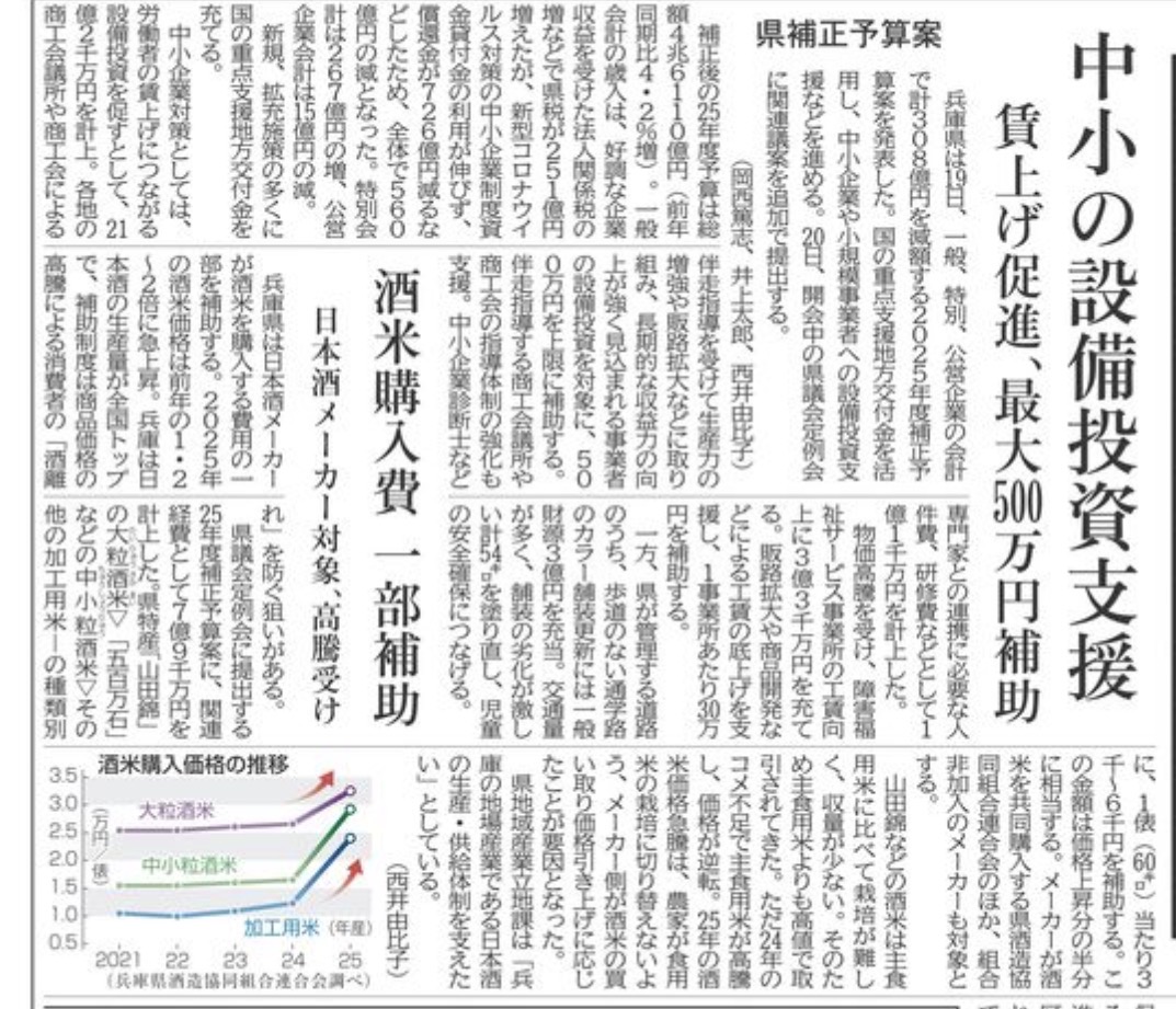 中小企業の設備投資支援や酒米価格高騰への対応など、地域の産業や雇用を下支えする施策が